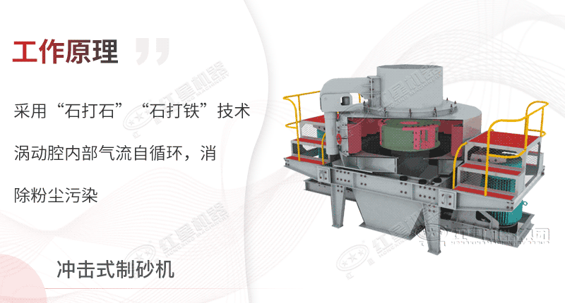 石料由机器上部直接落入高速旋转的转盘,在高速离心力的作用下,与另一部分以雨伞方式分流在转盘四周的靶石产生高速度的撞击和高密度的粉碎,石料在相互打击后,又会在转盘和机壳之间形成涡流运动而造成多次的互相打击、磨擦、粉碎,此过程循环往复,直至成品粒度符合要求后从下部直接排除。